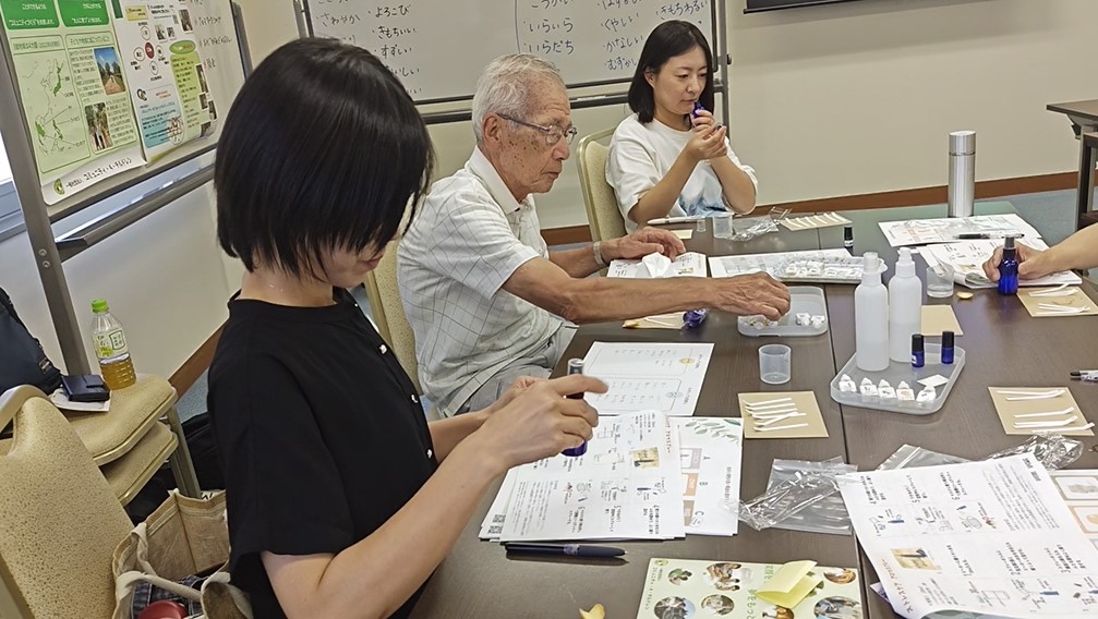 第2部では、【癒やしの香りを見つけるアロマワークショップ】を行いました。“気持ち”にはどんなものがあるか、ネガティブな気持ち、ポジティブな気持ち、思いつくまま書き出す個人ワークを行った後、グループで共有しました。皆さんの発表を聞いて、忘れていた気持ちや多様さに気づく時間になりました。次のワークでは、自分の好きな香りや嫌いな香り、その香りを嗅いだ時にどんな気持ちになるか書き出し、香りの心や体への影響を知りました。ワークの後は、いよいよオリジナルアロマスプレーづくり!いくつか精油を香り、直感で「好き」と感じたもの、心が喜んでいるものを選び、どんなときに使いたいかイメージしながら作りました。「この精油を混ぜてみようかな」、「もうちょっとこの精油を足そうかな」と、完成後の香りを想像しながら、楽しいワークショップの時間となりました。