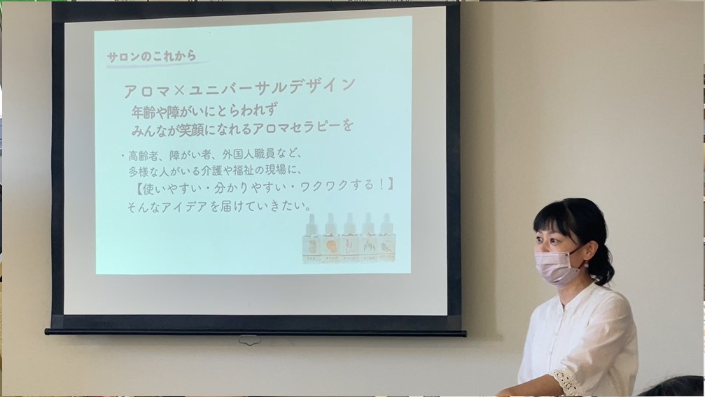 第1部では、【介護士の私がアロマサロンを始めた話】と題し、取り組まれている活動、サロンを始めたきっかけや想いをうかがいました。この日のために動画を作成くださり、東日本大震災の発生後、災害ボランティアとして現地に行かれたことが小窪さんの癒やしの道の始まりとなったこと、時間をかけて人を癒やす技術を学び身につけ、今の活動に繋がっていることを伝えてくださいました。また、高齢者やしょうがい者、外国人職員など、多様な人がいる介護や福祉の現場に「癒やし」と「笑顔」を届けるため、アロマ×ユニバーサルデザインのアイデアを形にしていきたいと、今後の展望も聞かせていだきました。大切な人や自分自身を癒やせるように、その方法を伝えていきたい、人を応援したいという小窪さんの想いが伝わってくる時間でした。